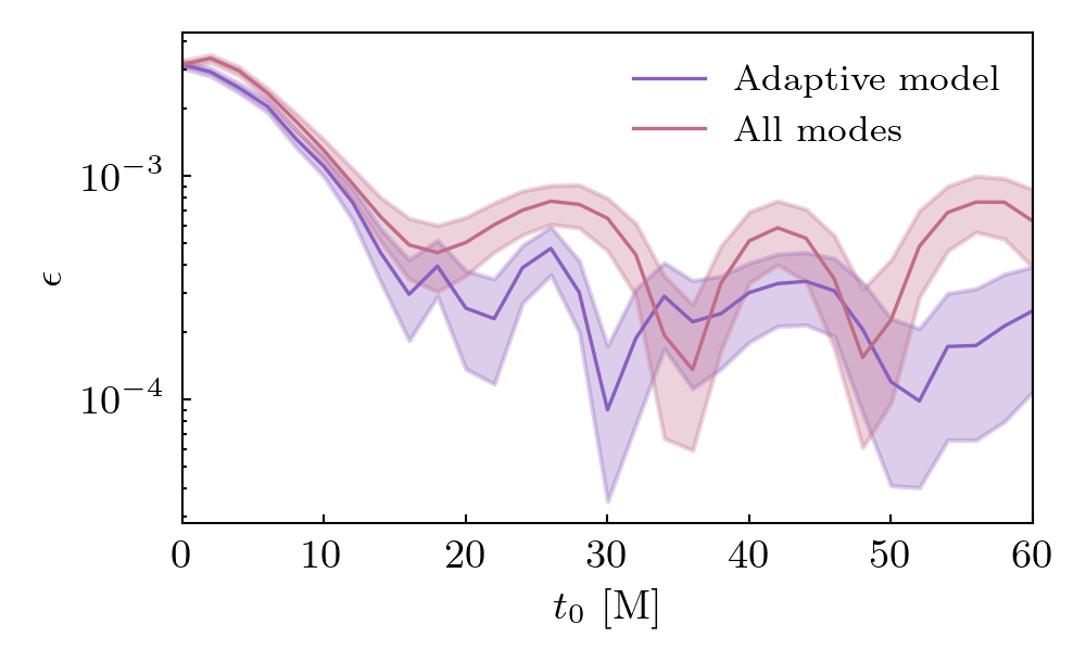 Times QNMs are present is shown below. Solid lines indicate prograde modes, hatched lines indicate retrograde modes. Vertical grey shaded regions (where present) show poor fit times.