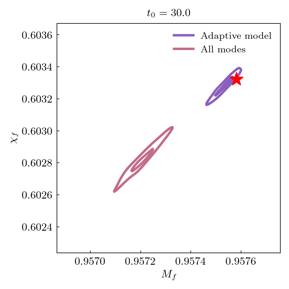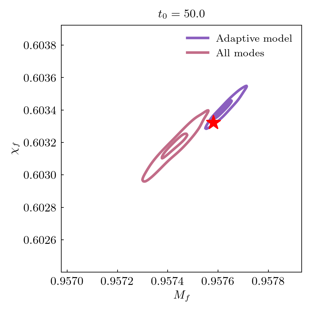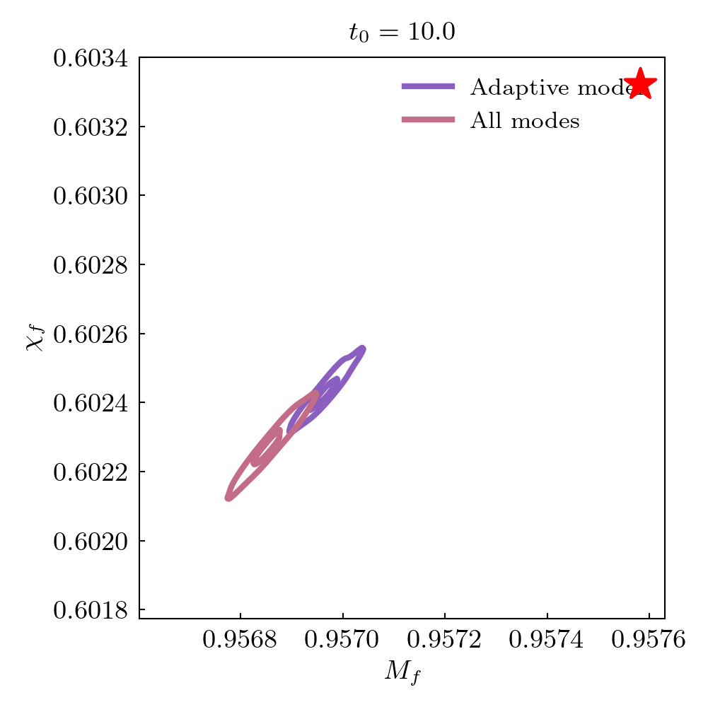 Remnant black hole mass and spin estimates are compared to NR values. Root square distance and posteriors at different start times are shown. The star indicates the NR value.