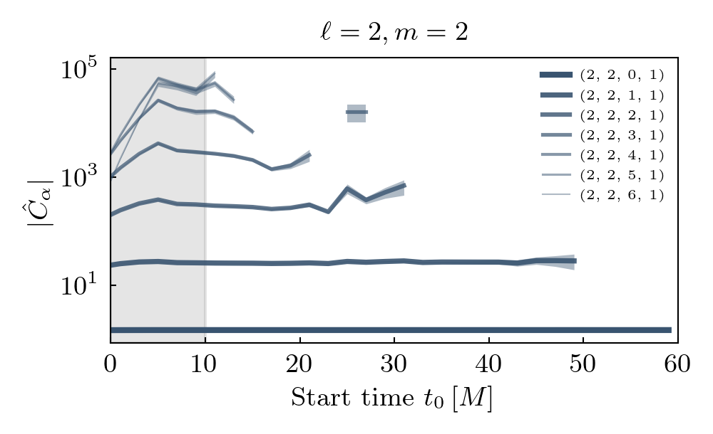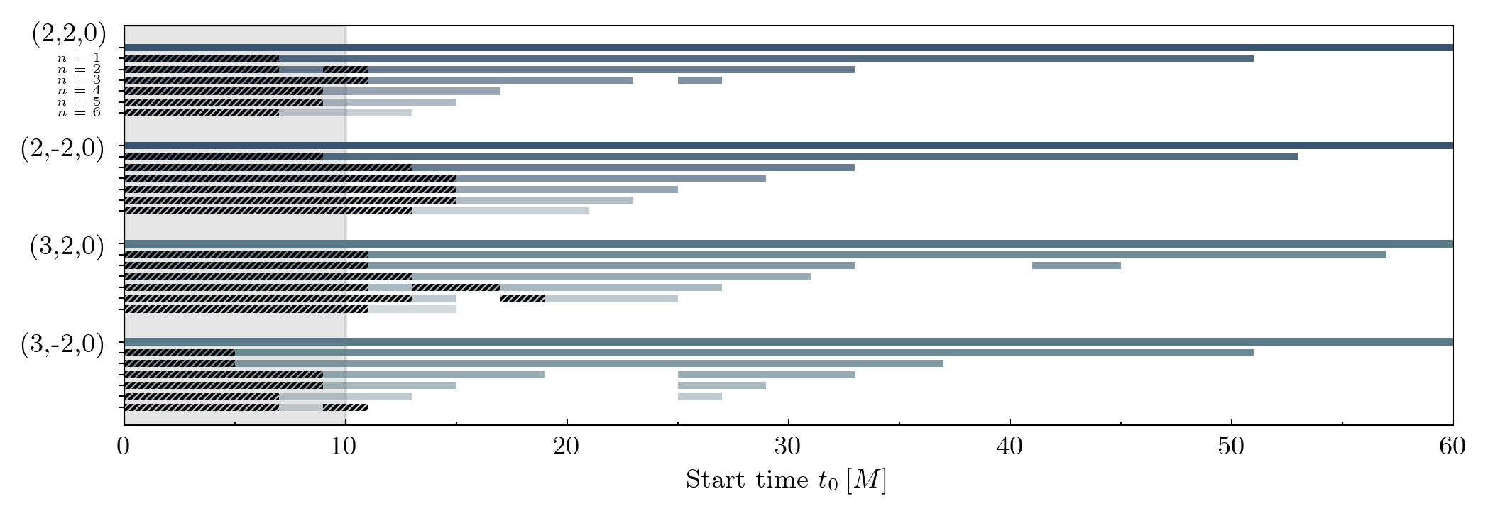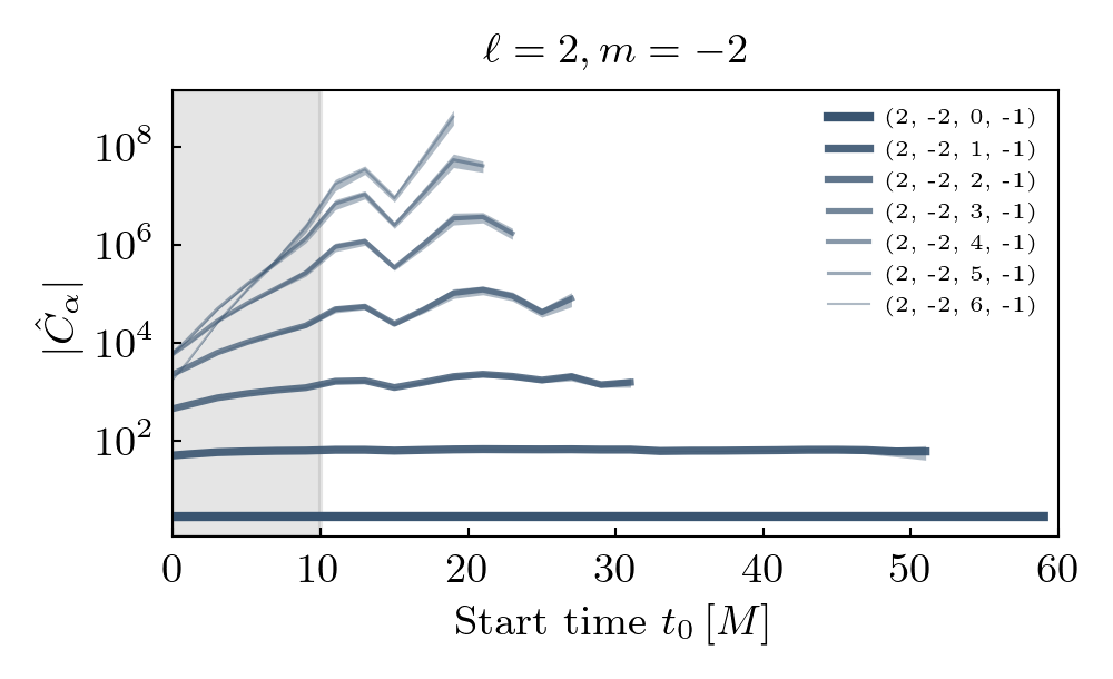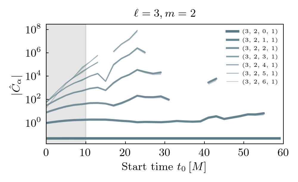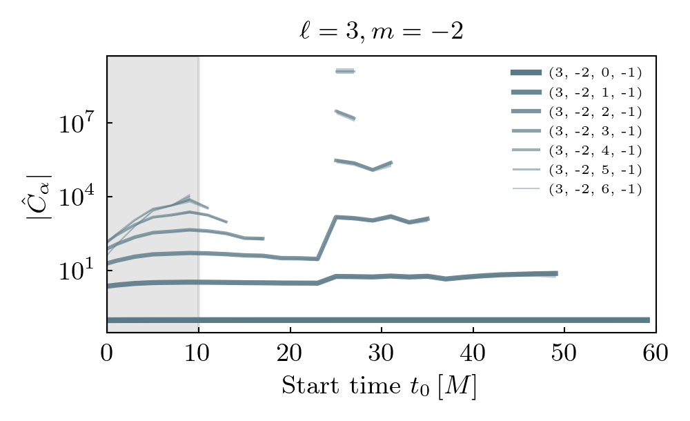 This simulation contains four instances of a retrograde mode present without a prograde mode, which are not shown on the mode content plot. These are the (2, 2, 6, -) mode at timestept0 = 18.0 [M], and the (3, 2, 6, -) mode at timesteps t0 = 18.0 [M], t0 = 20.0 [M], and t0 = 28.0 [M].