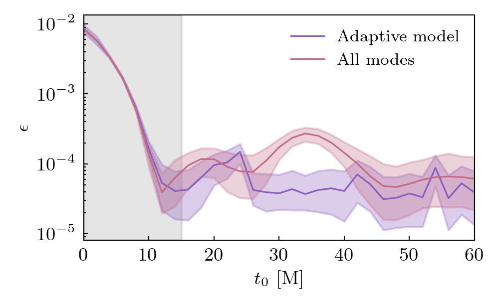 Times QNMs are present is shown below. Solid lines indicate prograde modes, hatched lines indicate retrograde modes. Vertical grey shaded regions (where present) show poor fit times.