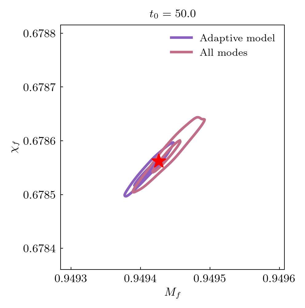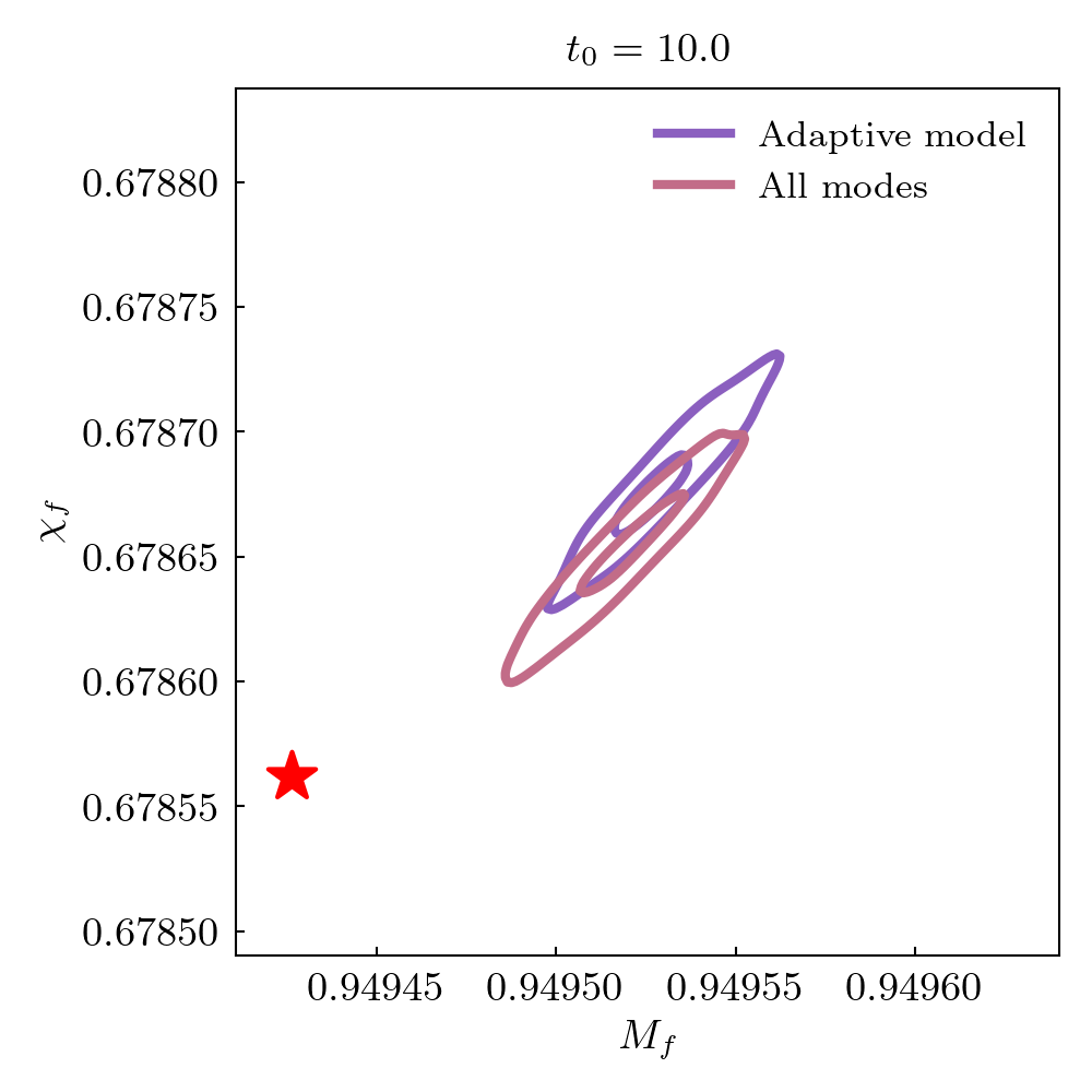 Remnant black hole mass and spin estimates are compared to NR values. Root square distance and posteriors at different start times are shown. The star indicates the NR value.