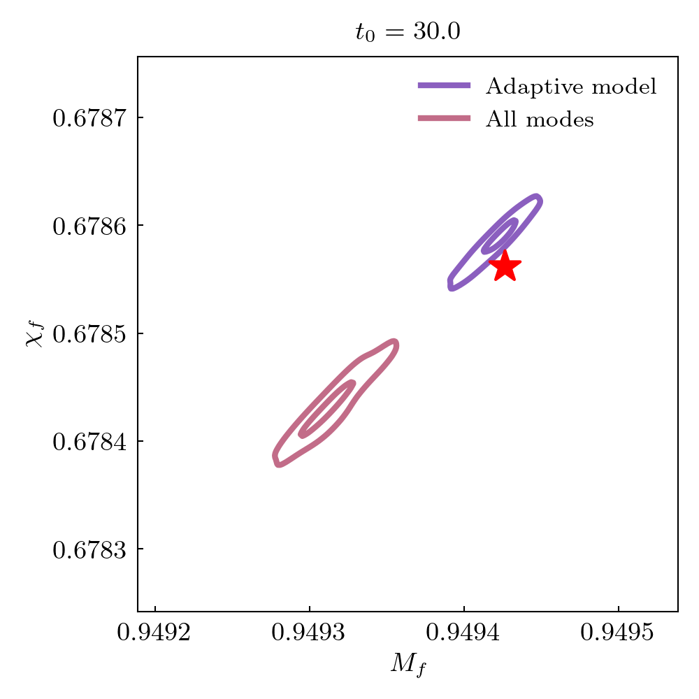 This simulation contains four instances of a retrograde mode present without a prograde mode, which are not shown on the mode content plot. These are the (2, 2, 6, -) mode at timestep t0 = 18.0 [M], and the (3, 2, 6, -) mode at timesteps t0 = 18.0 [M], t0 = 20.0 [M], and t0 = 28.0 [M].