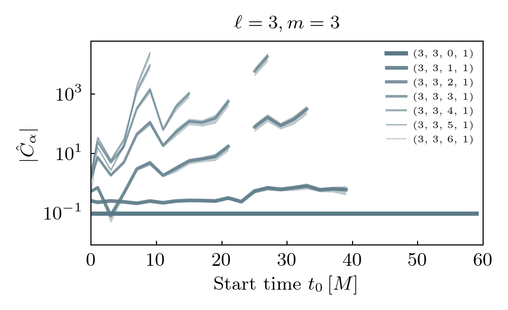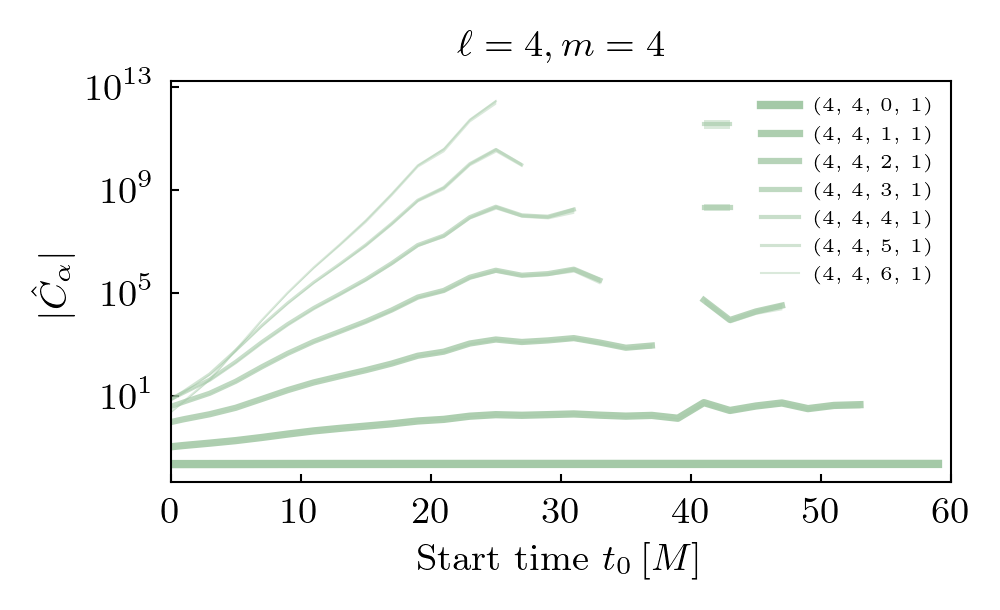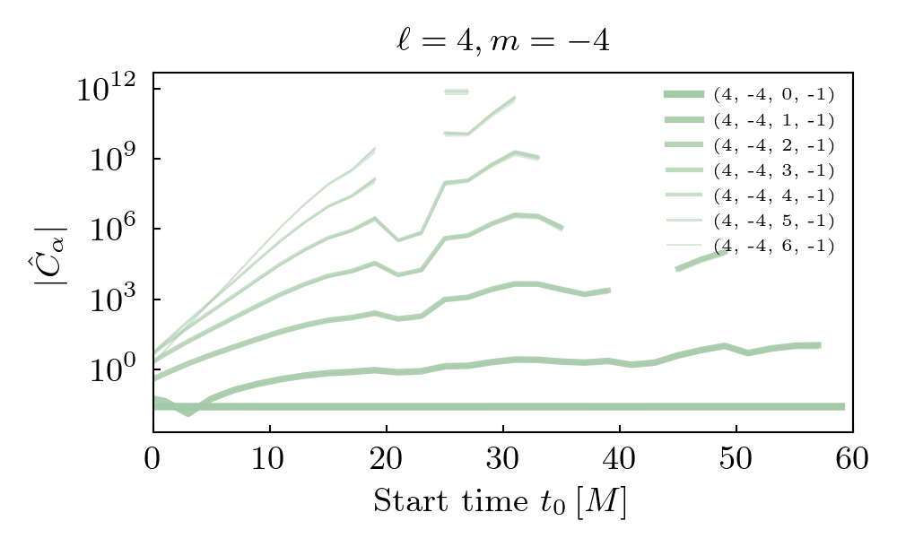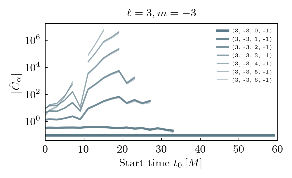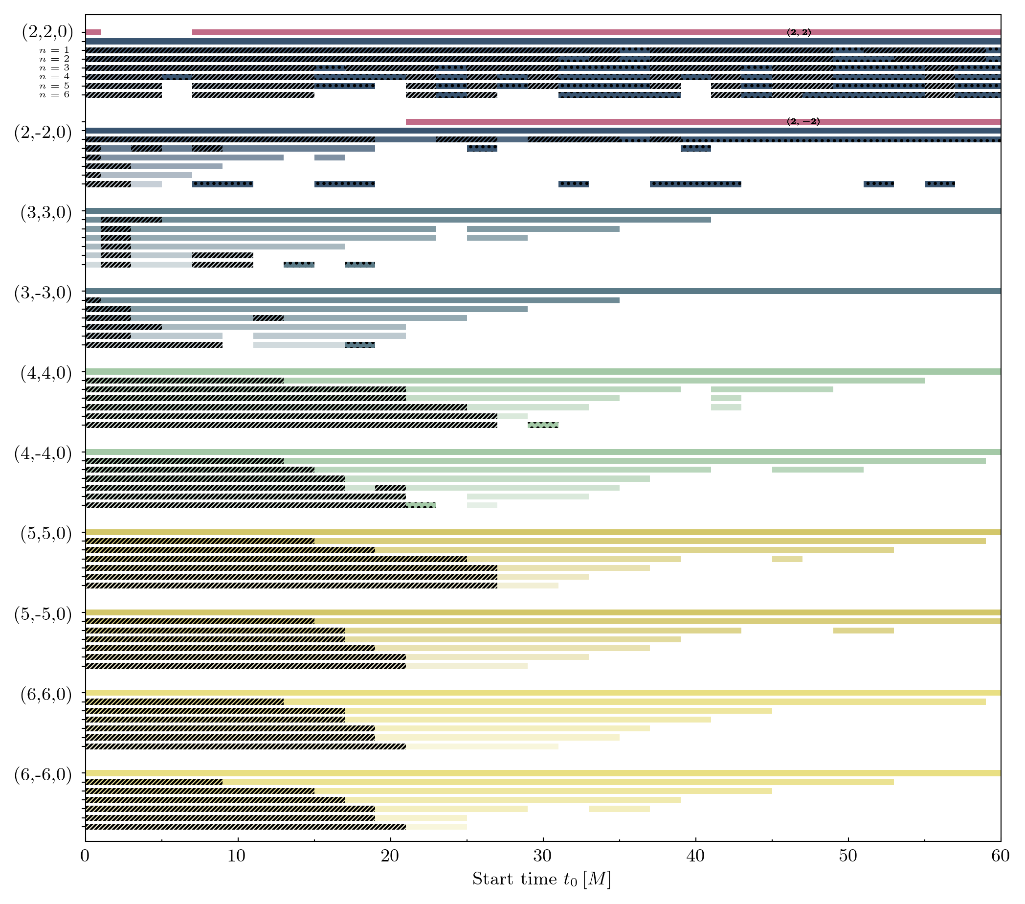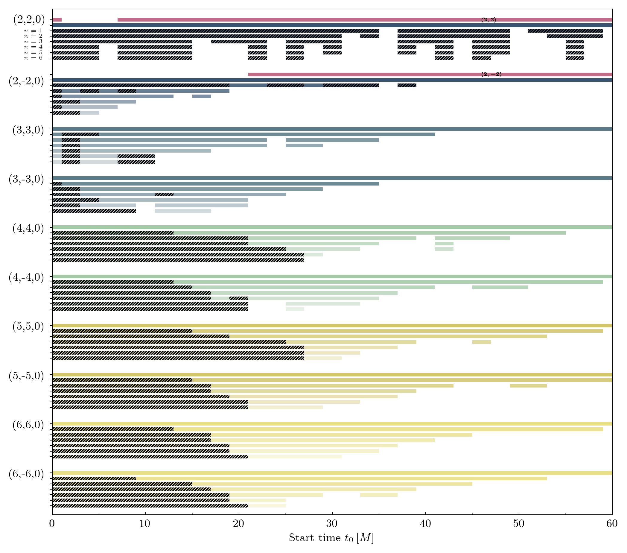 This simulation contains multiple instances of a retrograde mode present without a prograde mode, which, in this exceptional case, have been shown on a separate plot as dotted regions. Furthermore, this is the only simulation found to contain a constant offset, which is shown in pink on the plots.