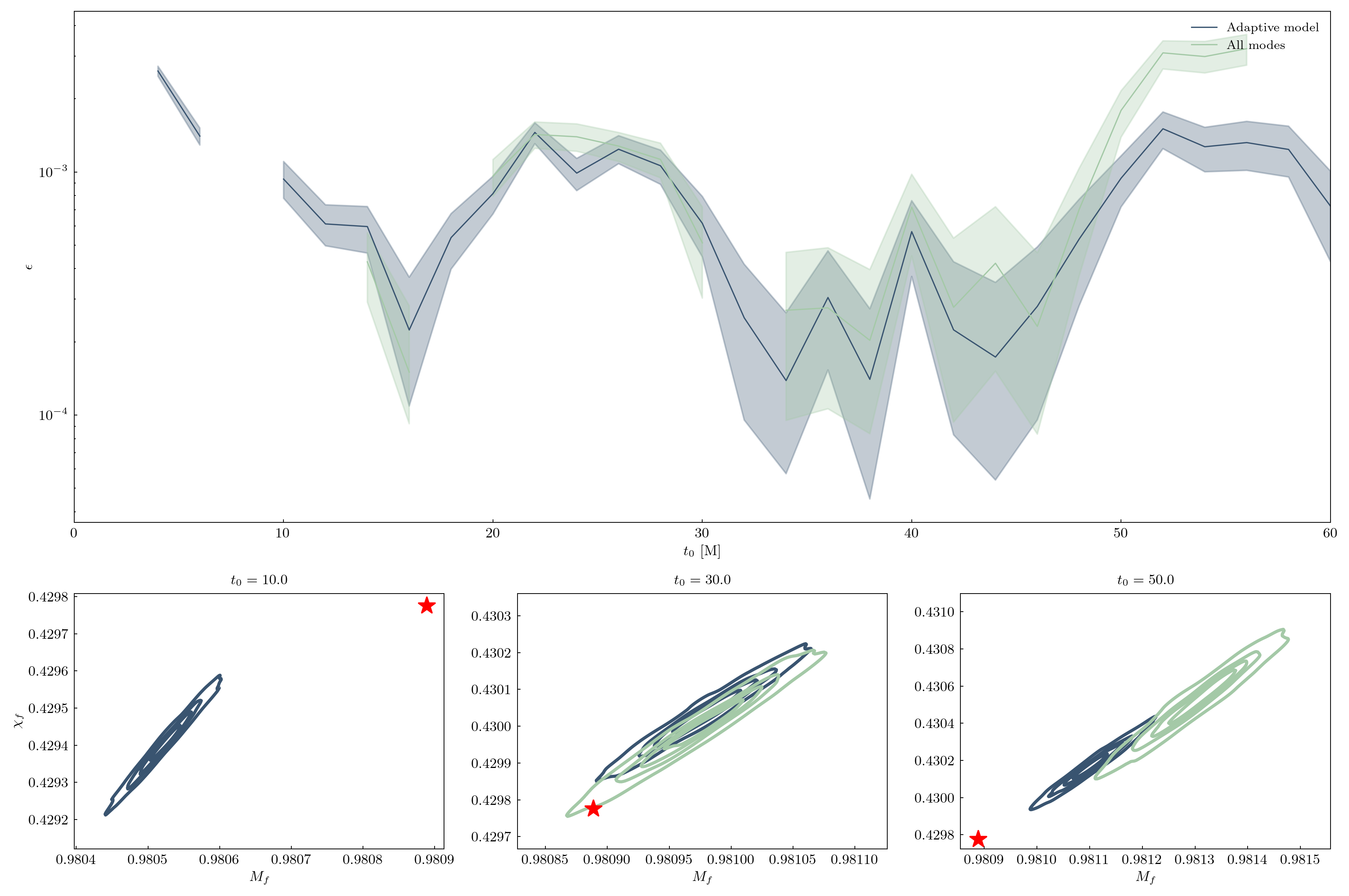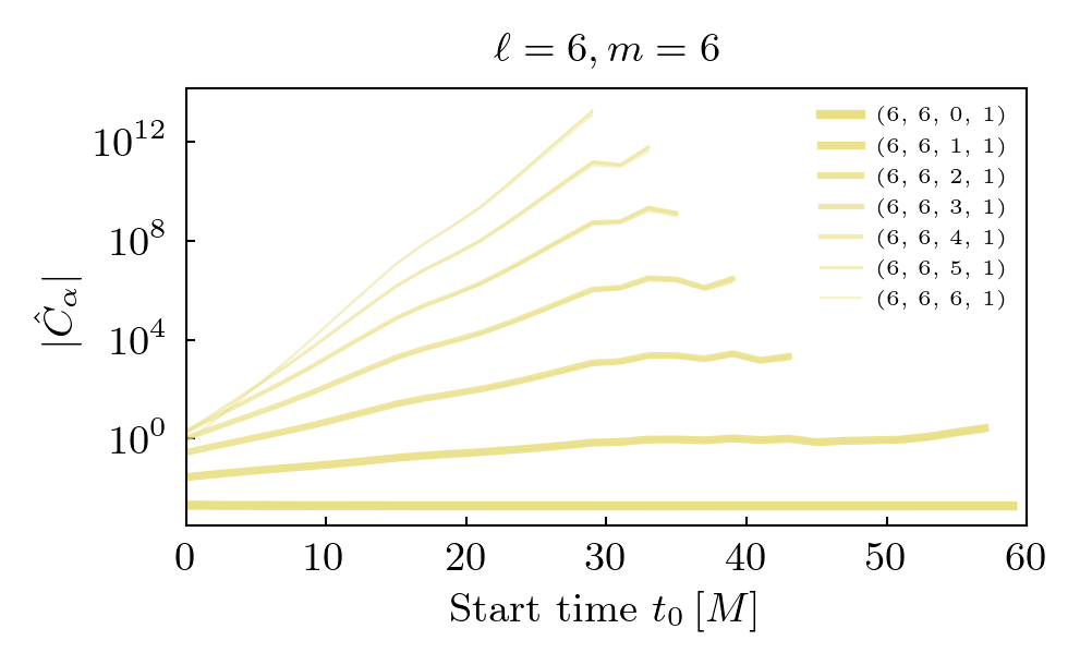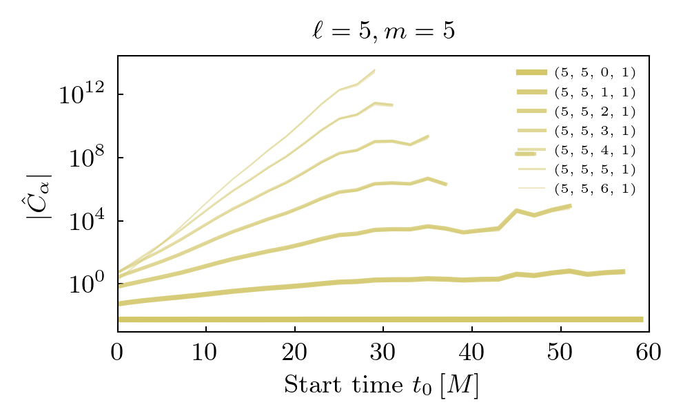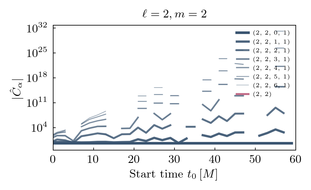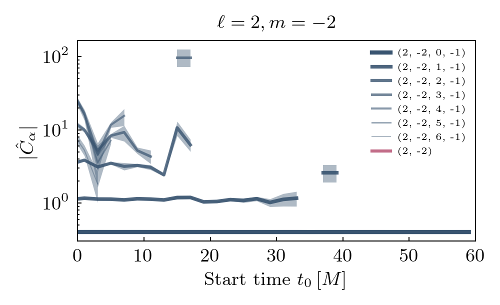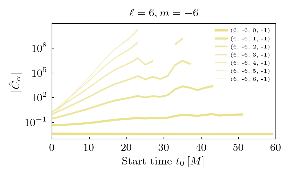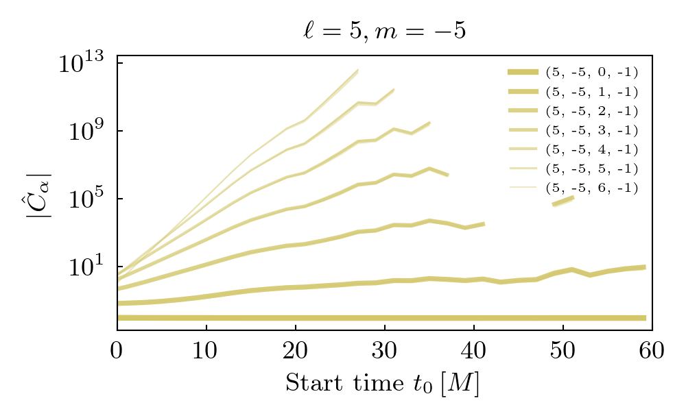 This simulation contains multiple instances of a retrograde mode present without a prograde mode, which, in this exceptional case, have been shown on a separate plot as dotted regions. Furthermore, this is the only simulation found to contain a constant offset, which is shown in pink on the plots.