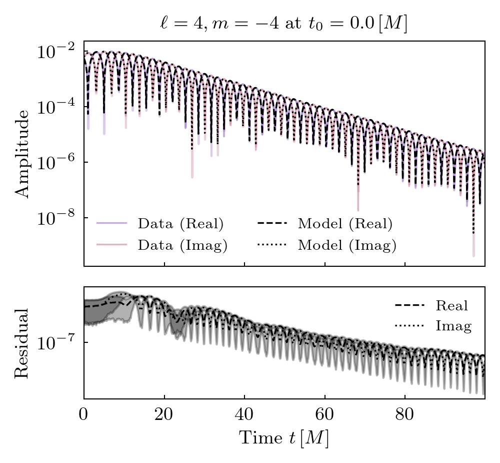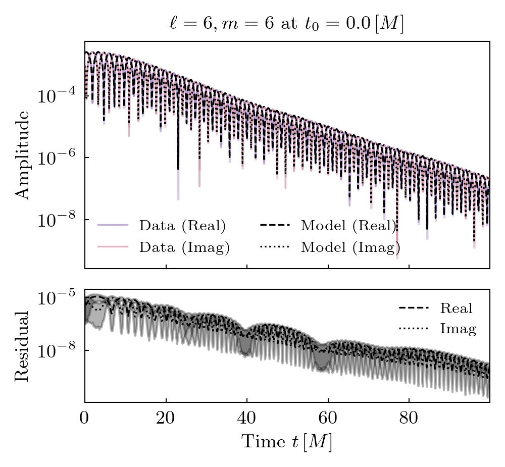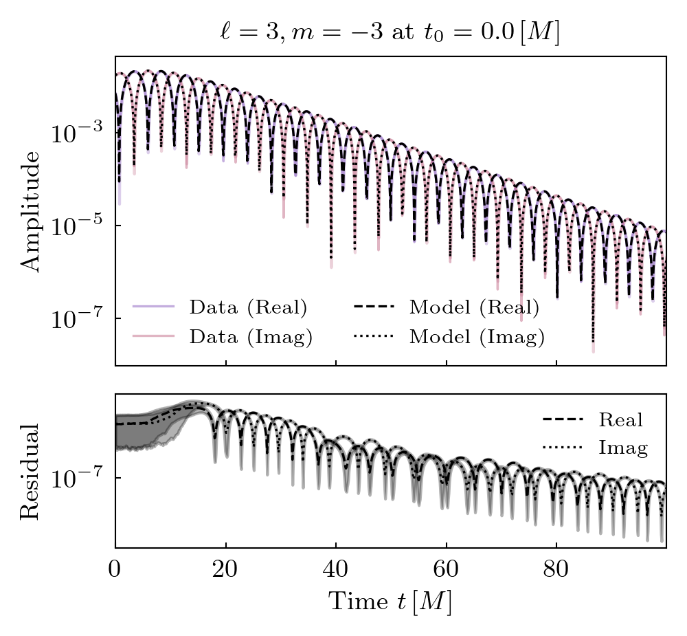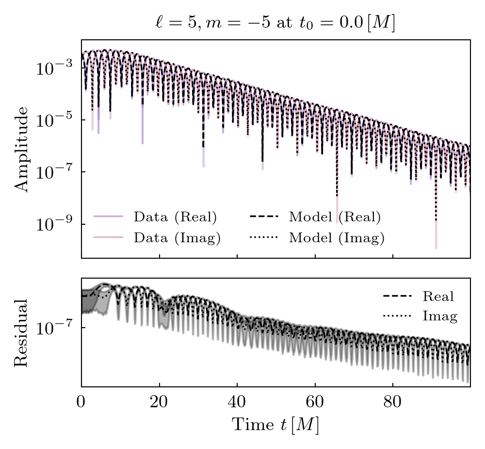 Times QNMs are present is shown below. Solid lines indicate prograde modes, hatched lines indicate retrograde modes. Vertical grey shaded regions (where present) show poor fit times.