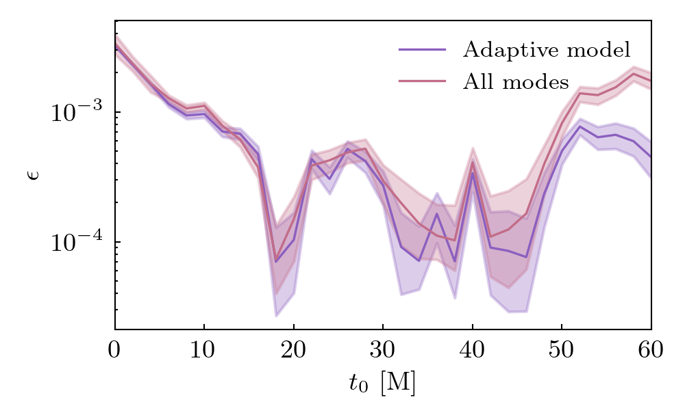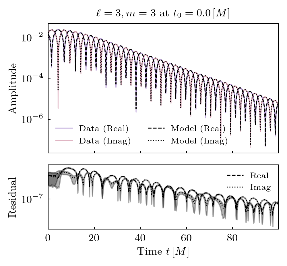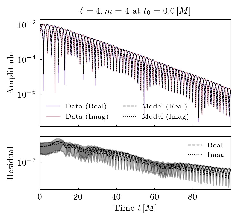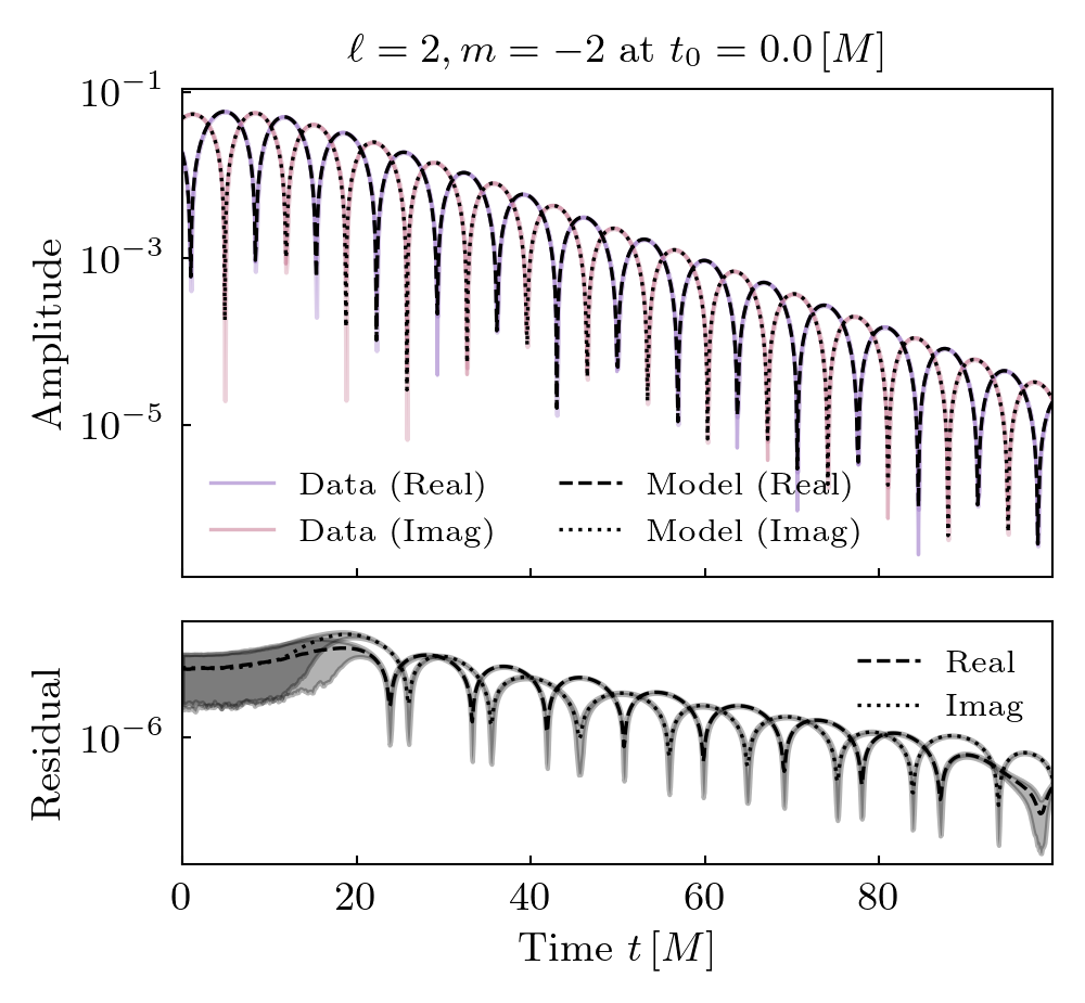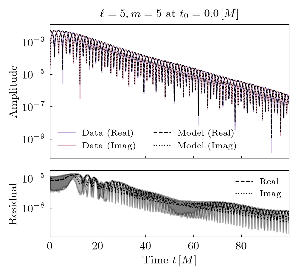 Times QNMs are present is shown below. Solid lines indicate prograde modes, hatched lines indicate retrograde modes. Vertical grey shaded regions (where present) show poor fit times.