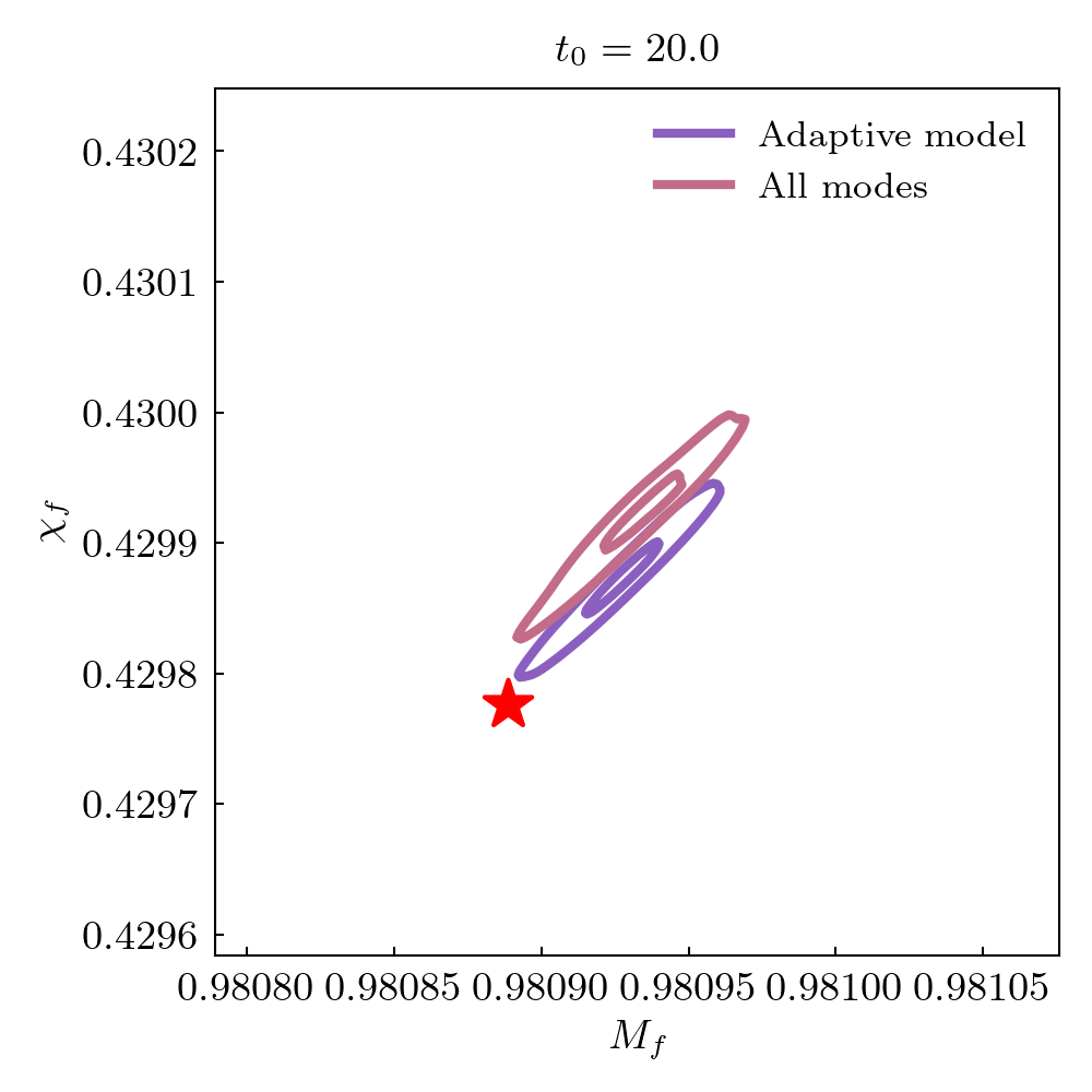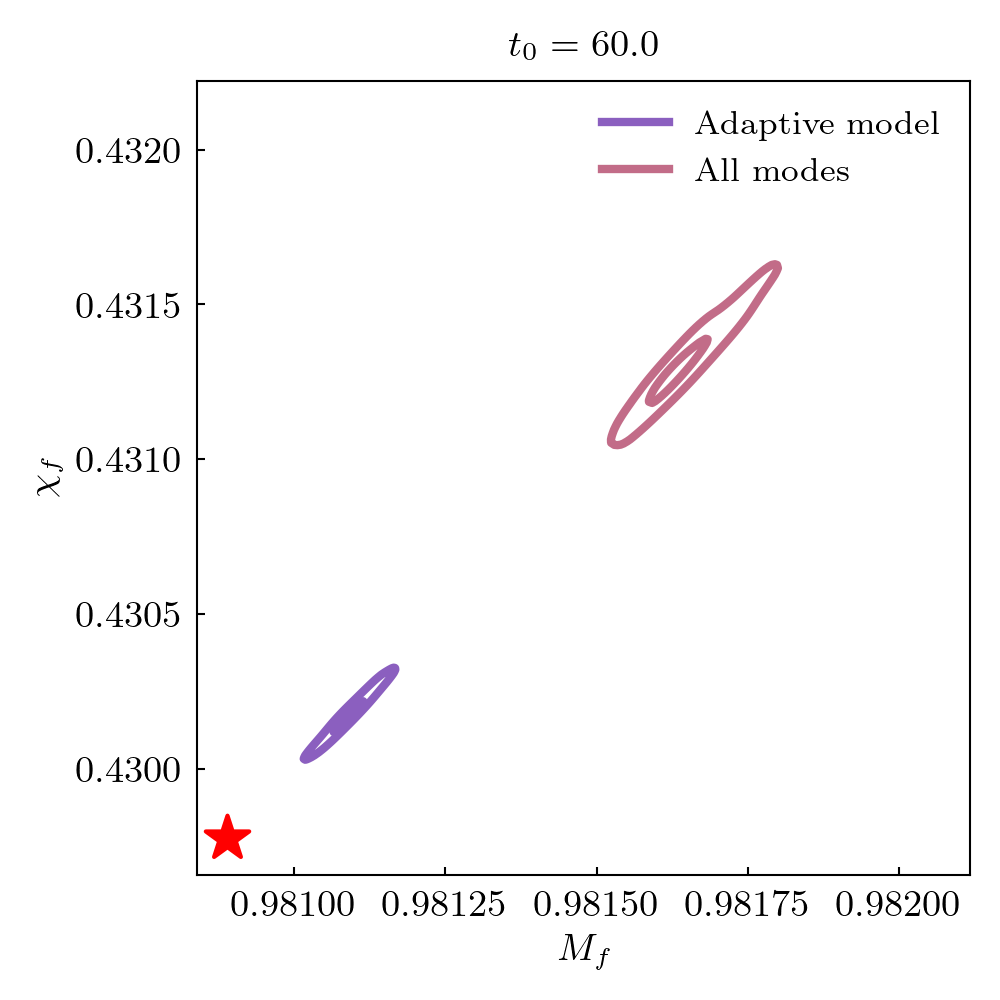 Remnant black hole mass and spin estimates are compared to NR values. Root square distance and posteriors at different start times are shown. The star indicates the NR value.