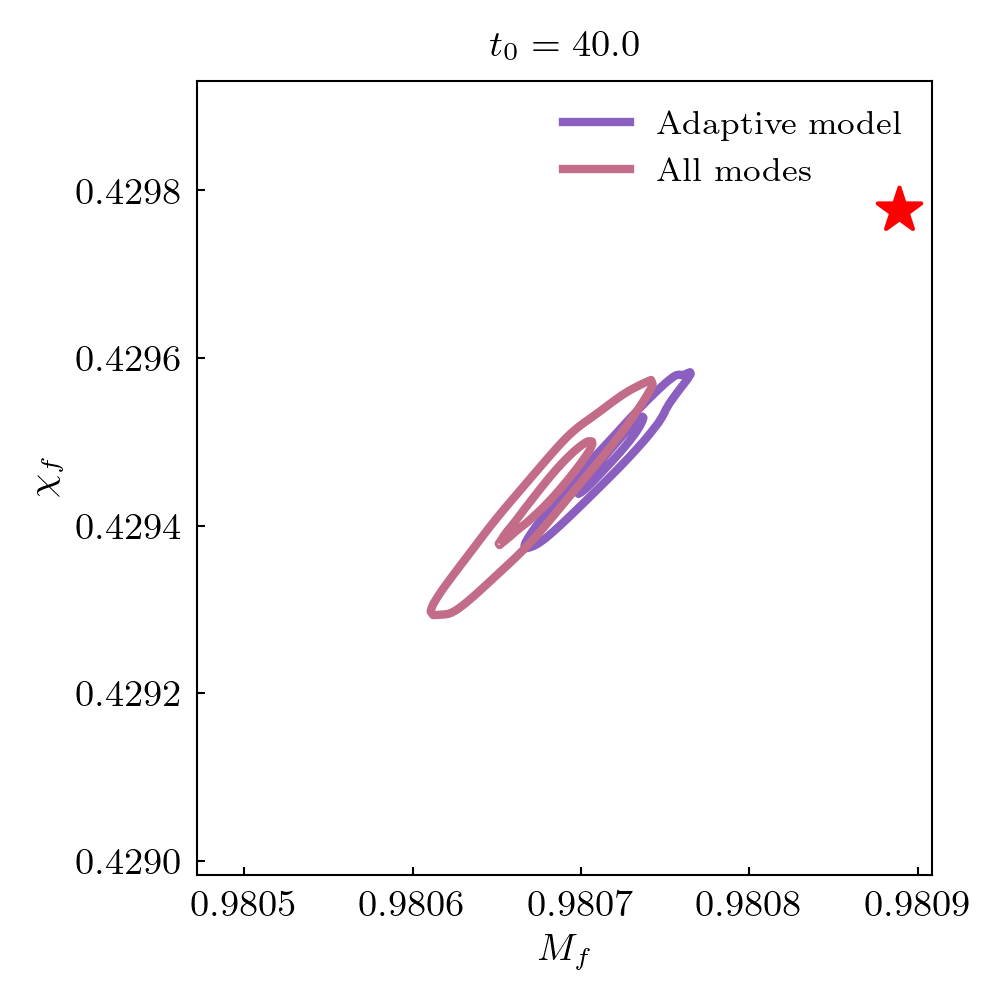 For this highly precessing system, we have found that QNM fits, and our algorithm, produce unreliable results. Therefore while we include the results from this simulation for completeness, we caution the reader against drawing any conclusions from them.